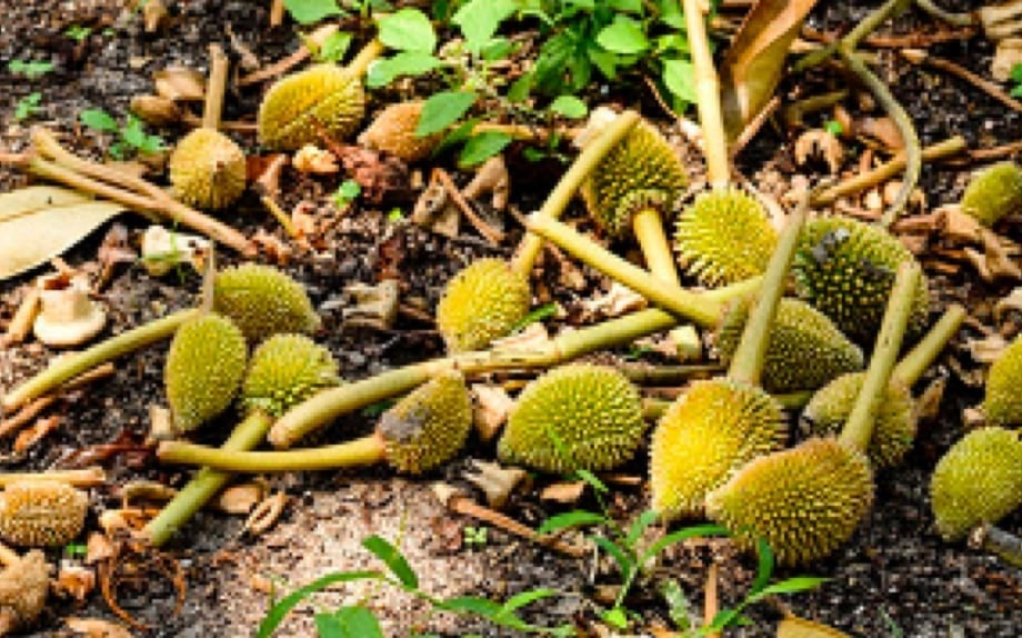 Sầu riêng bị sốc nhiệt gây ra hiện tượng rụng trái non hàng loạt. Ảnh: Công Hoàng.