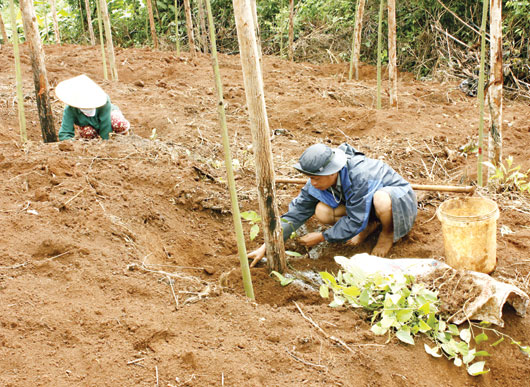 Bên những trụ tiêu vừa mới được dựng và những dây tiêu mới ươm đang chuẩn bị trồng, anh Lộc cho biết: Tôi không biết gì về kỹ thuật trồng tiêu, lại chưa hề biết chăm sóc nhưng thấy người dân ở đây họ trồng nhiều, nhiều nhà giàu lên nhờ tiêu nên cũng đành liều một phen, coi như vừa học vừa làm. Tôi mua dây tiêu ở ngoài thị trường về trồng đại và chỉ nghe người ta nói là đảm bảo chứ không biết chất lượng ra sao, sau này có cho nhiều trái hay không nữa.