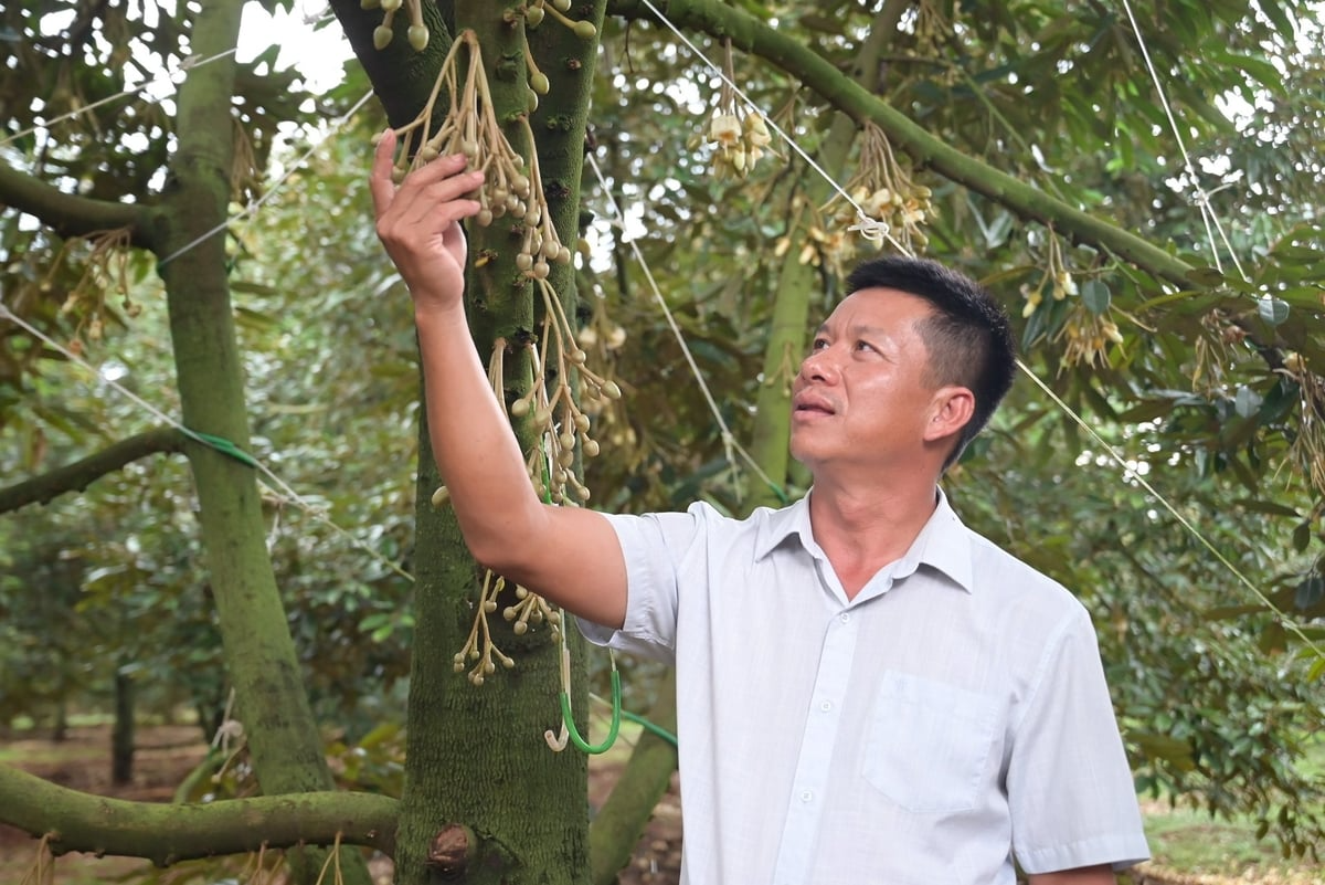 Ông Trần Vi Tuấn, phường Đông Gia Nghĩa, tỉnh Lâm Đồng kiểm tra trái sầu riêng đang chuẩn bị thu hoạch. Ảnh: Phạm Hoài.