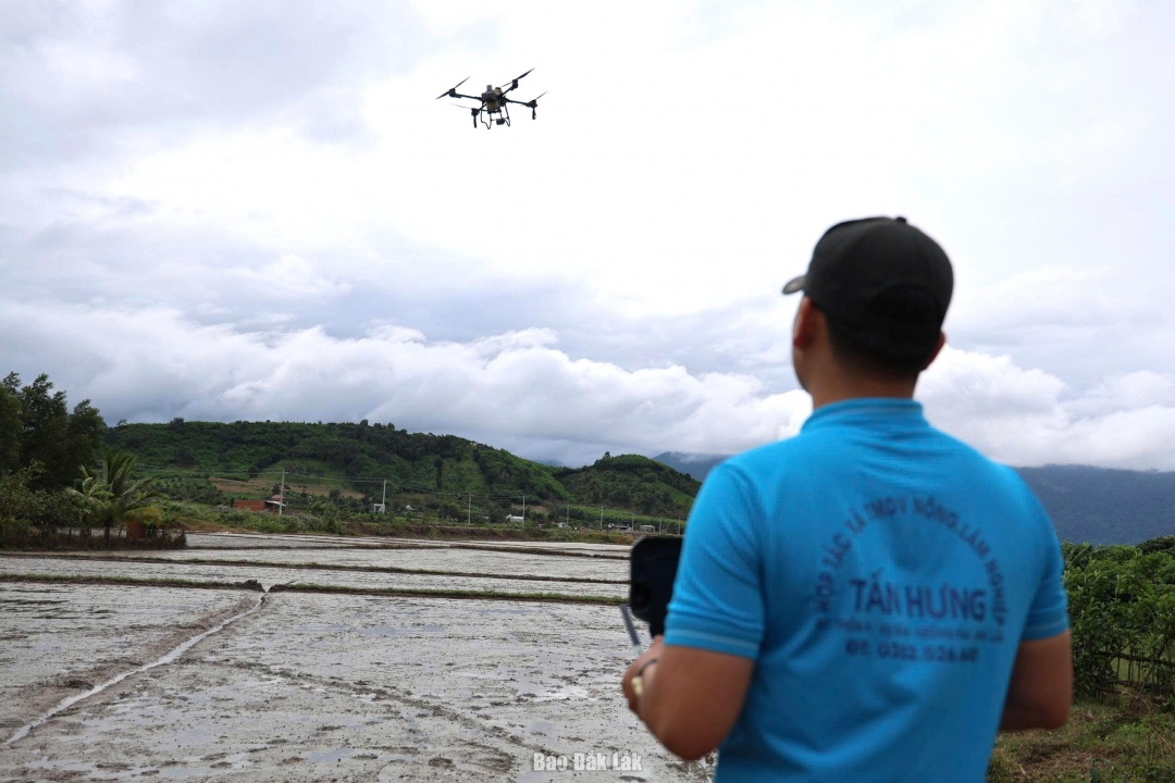 HTX Thương mại dịch vụ nông, lâm nghiệp Tấn Hưng (xã Vụ Bổn) ứng dụng máy bay không người lái bón phân cho cánh đồng lúa